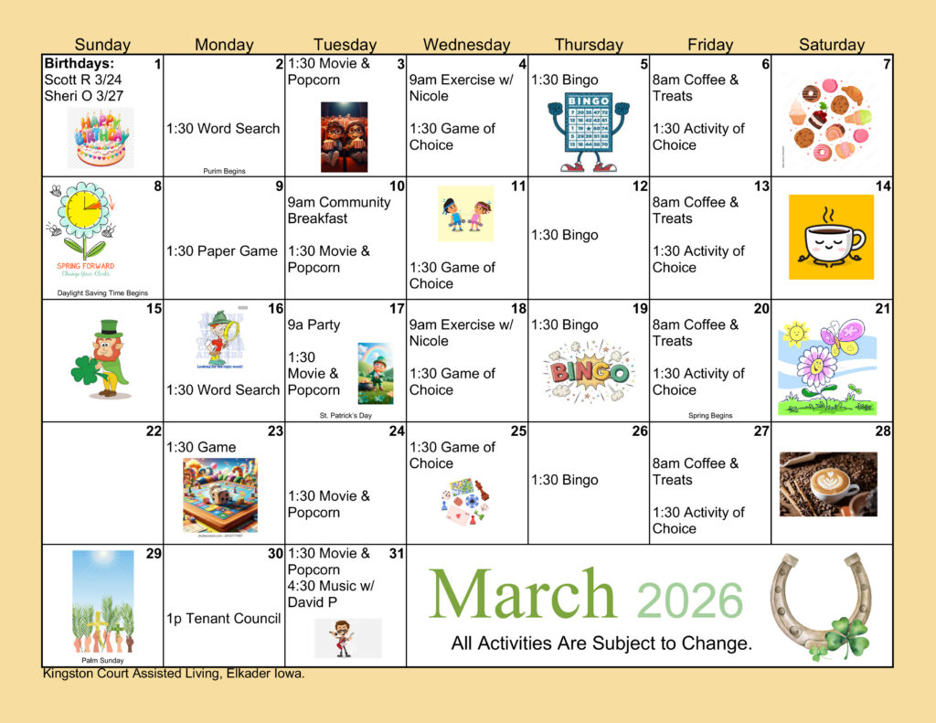 March 2026 Kingston Court Activity Calendar